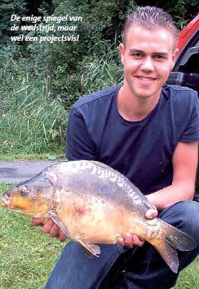 Rond 16:00 uur is het telefoontje dan toch daar. Baris Sari en Marvin Swagerman op stek 6 melden dat ze een karper hebben gevangen. Gewapend met fotocamera, weegschaal en weegsling loop ik (Marcel Merk) er naartoe en meteen krijg ik een vreemd gevoel over me. “Een projectkarper, dat zou nog eens een mooie start zijn.” De onthaakmat wordt opengevouwen en… Een spiegelkarper. Een overduidelijke Peschkens wordt getoond. We wegen de karper en een mooie 7,6 pond wordt genoteerd. Snel een paar foto’s van vanger met de vis en van de linkerzijde van de karper natuurlijk.